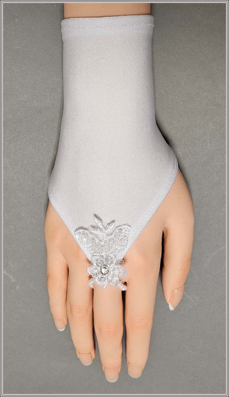 Białe elastyczne rękawiczki do komunii dla dziewczynki. Zakładane na jeden paluszek. Ozdobione małą koronkowa aplikacją obwicie obszytą koralikami i perełkami.