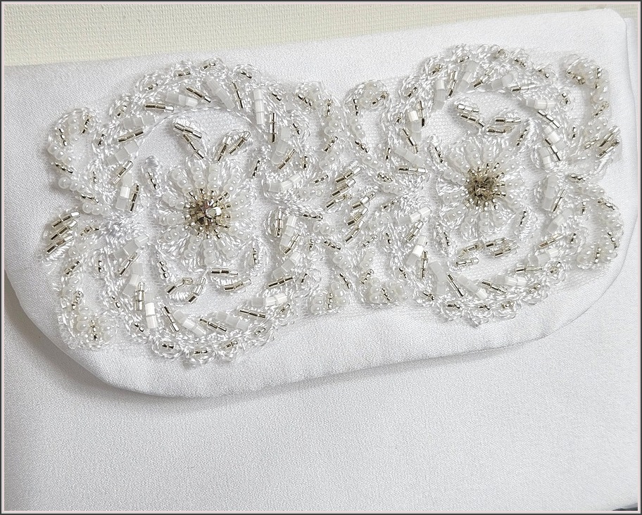 Ozdobiony kokardką z koronkowym kwiatkiem obficie obszytym koralikami i perełkami
