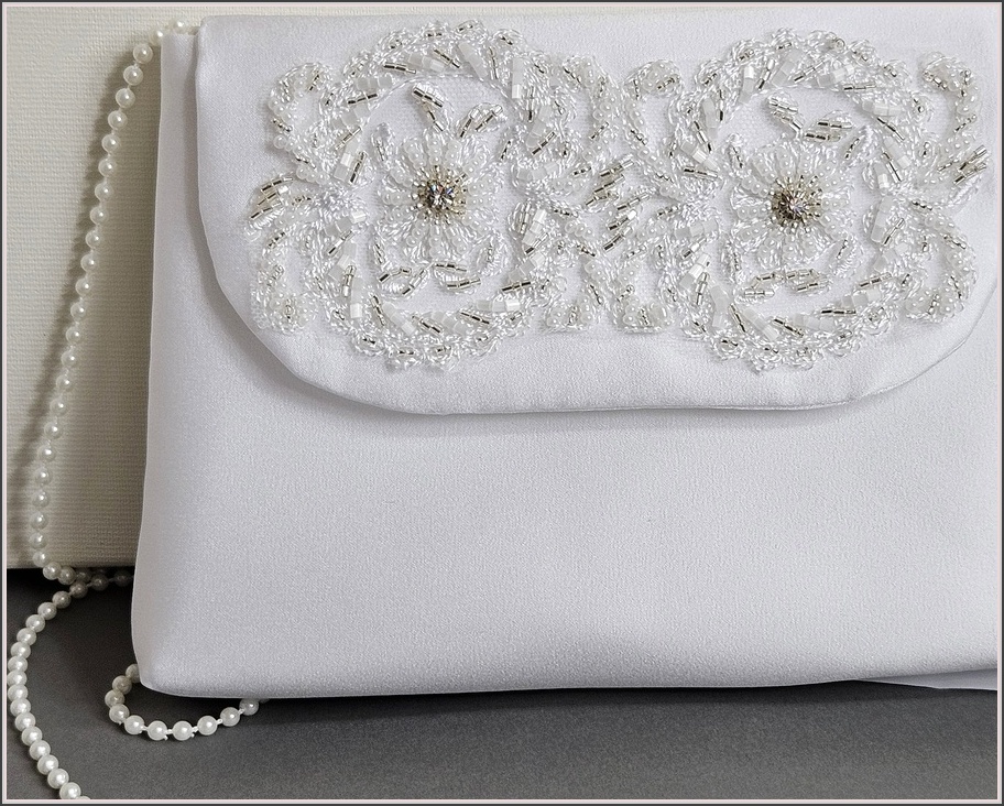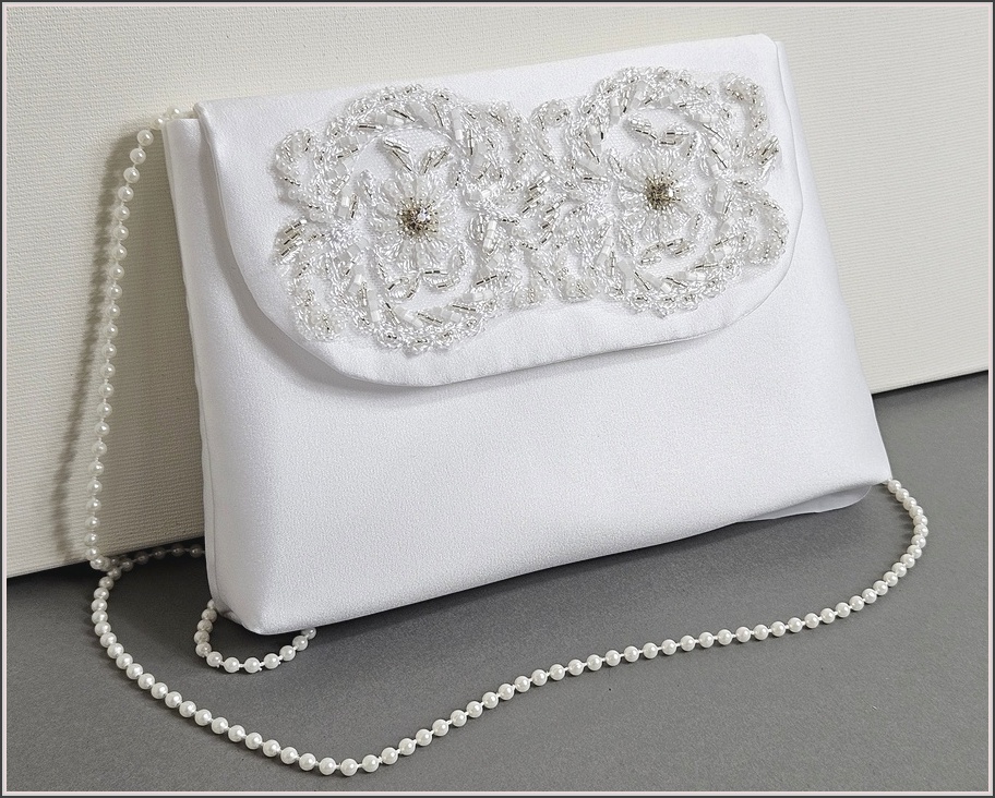 Biała torebka komunijna trzywarstwowa z satyny ślubnej pierwszego gatunku, półmatowej, sztywnego tiulu i usztywnianej tkaniny CAMBEL. Torebka posiada perełkową rączkę o długości około 96 cm. Długość ta pozwala na swobodne przełożenie torebki przez ramię. Produkt ten jest idealny dla osób preferujących zdobione koronki