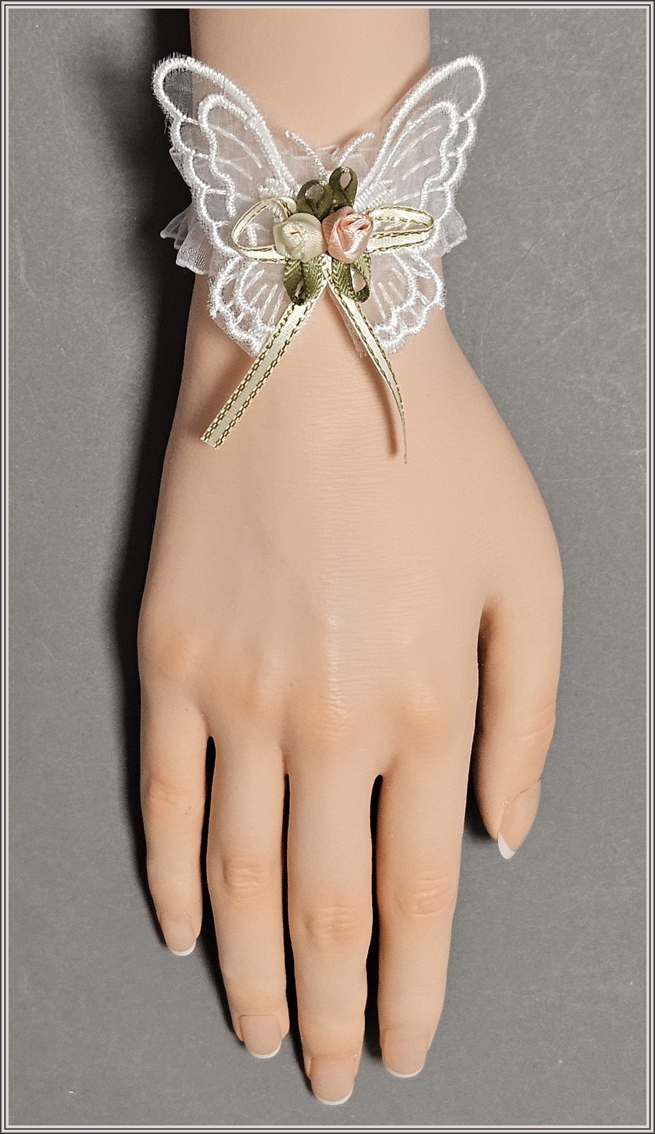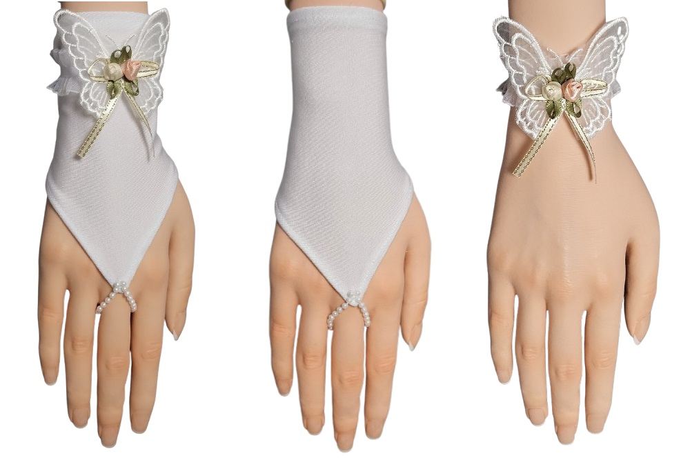 - Rękawiczki ozdobione zostały delikatną szyfonową aplikacją w kształcie motyla, na ozdobnej gumce