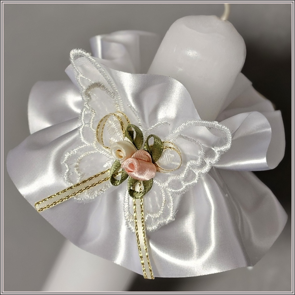 Okapnik na świecę komunijną wykonany z taśmy satynowej PREMIUM o szerokości 8 cm. Ozdobiony tak jak torebka szyfonowym motylkiem