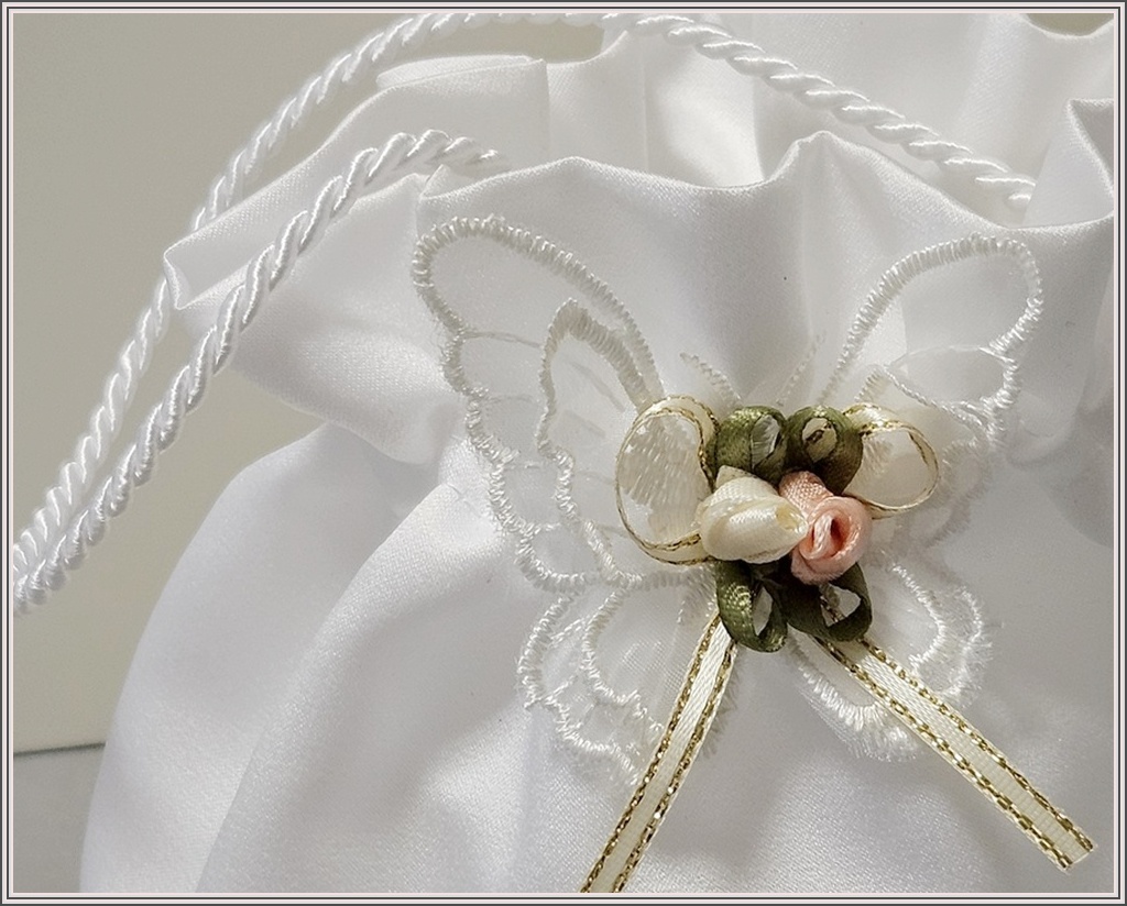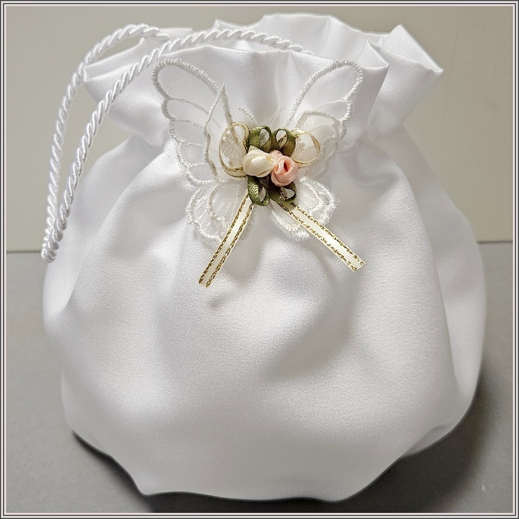 Torebka komunijna w kształcie sakiewki wykonana z satyny ślubnej półmatowej pierwszego gatunku.