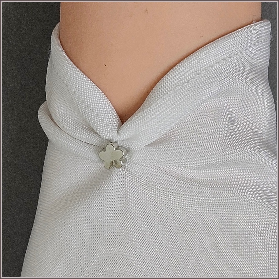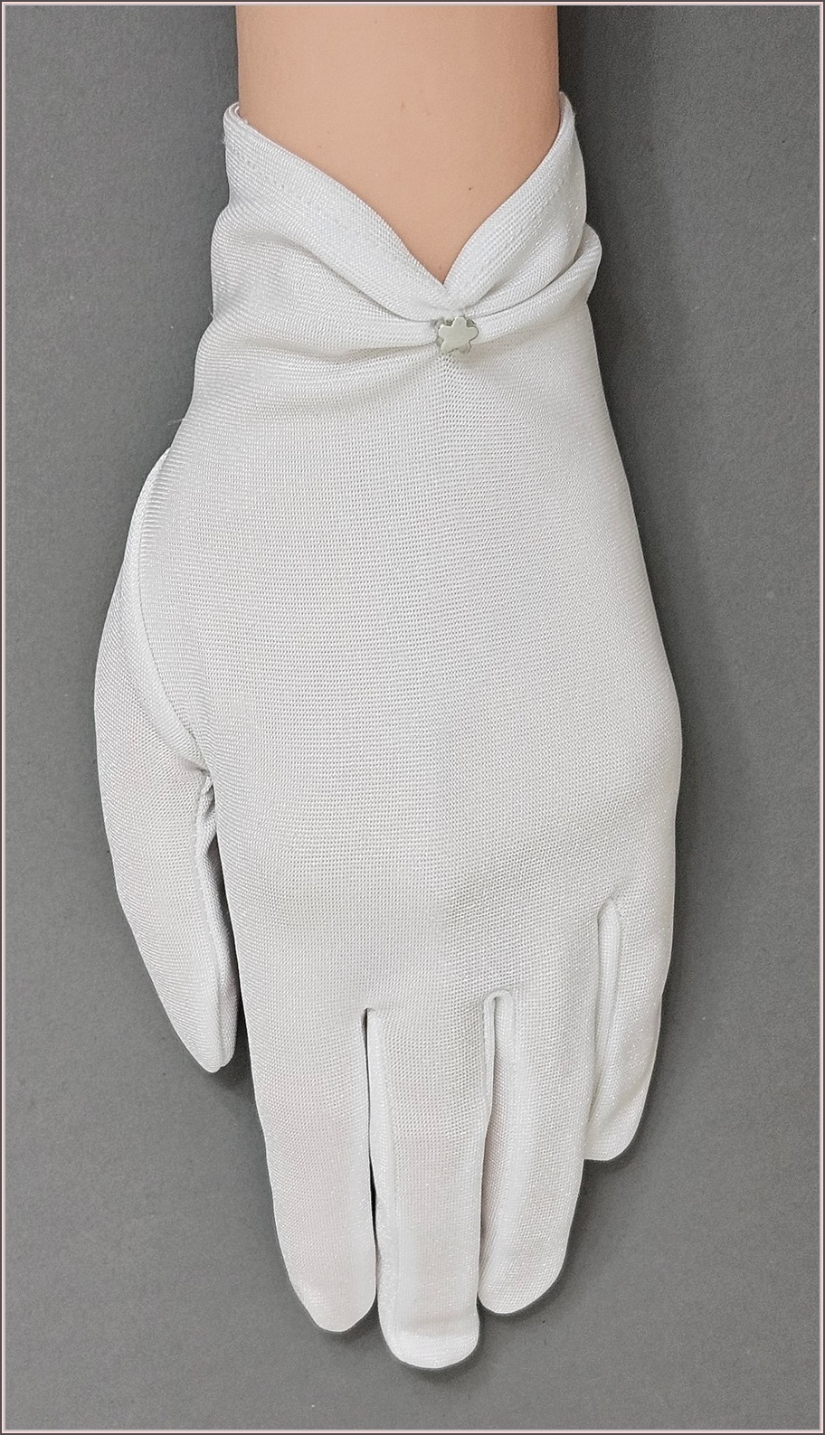 Białe elastyczne rękawiczki do komunii dla dziewczynki ozdobione małym srebrnym koralikiem