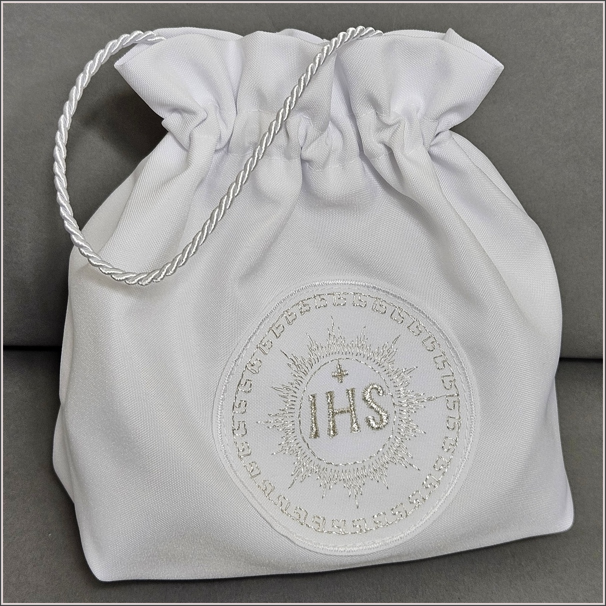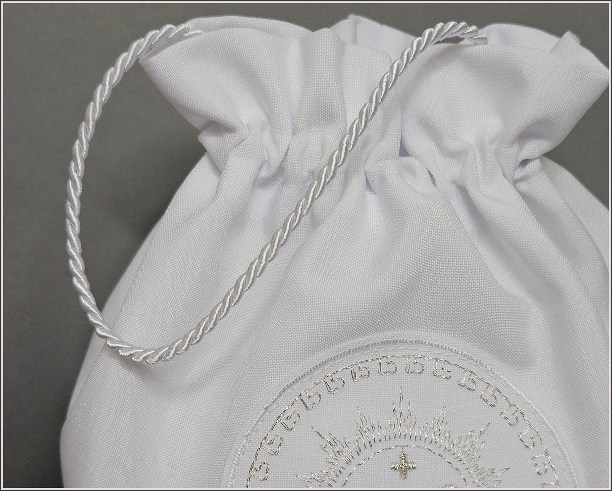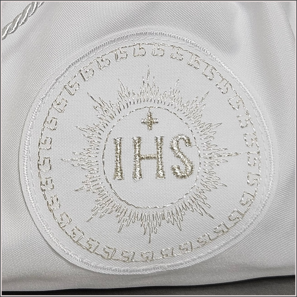 Woreczek ozdobiony został delikatną aplikacją z haftowanym srebrnym  symbolem IHS