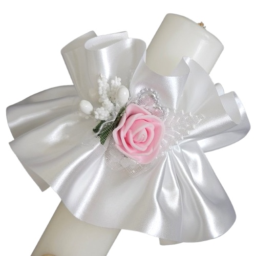 2w1 Okapnik i ozdoba na świecę komunijną lub do chrztu. Wykonany z taśmy satynowej PREMIUM o szerokości 8 cm. Okapnik z powodzeniem zastępuje plastikową profitkę na świecę, jednocześnie ozdabiając ją.  Cena nie obejmuje świecy