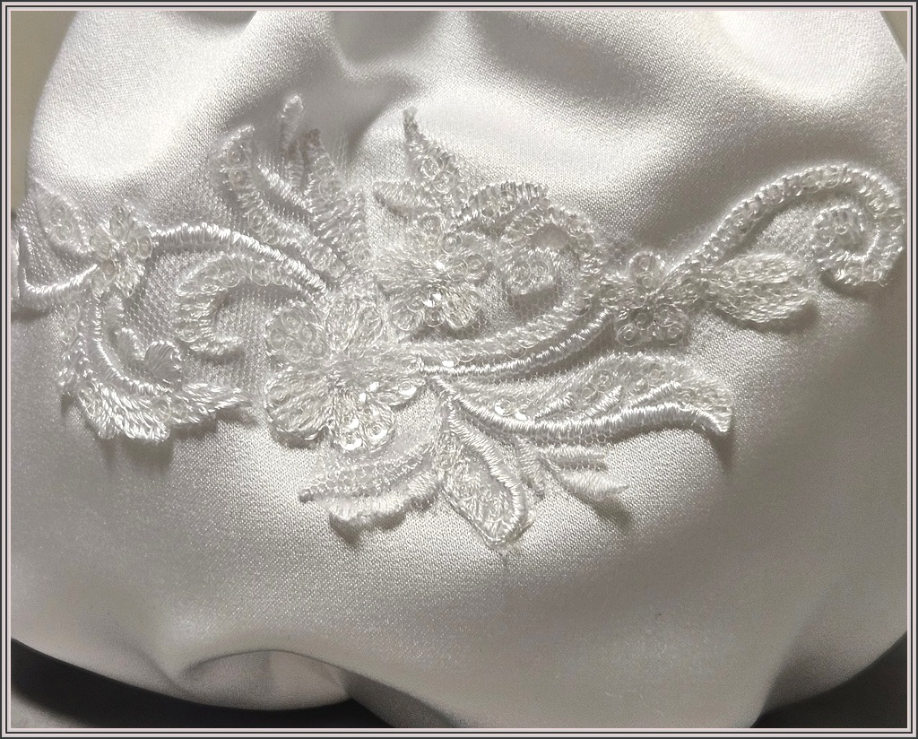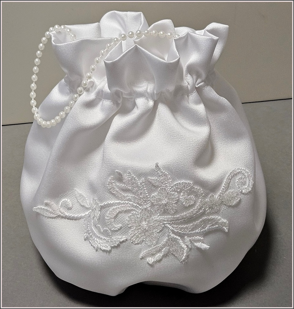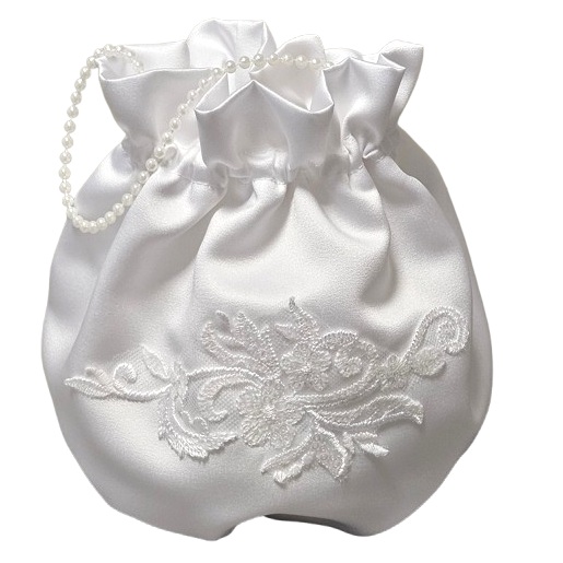 Torebka w kształcie okrągłego woreczka z satyny ślubnej półmatowej, pierwszego gatunku. Z rączką wykonaną z białego perełkowego sznurka o długości około 26 cm.